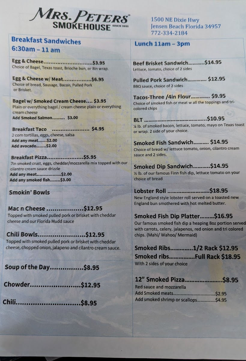Welcome to Mrs Peters Smokehouse, a hidden gem located at 1500 NE Dixie Hwy, Jensen Beach, FL. This delightful eatery celebrates the art of smoking seafood, serving dishes that are rich in flavor and steeped in local tradition. Guests rave about the succulent smoked salmon and the robust kingfish, both praised for their impeccable taste and preparation. The cozy, rustic ambiance exudes warmth, making it an inviting spot for family and friends.